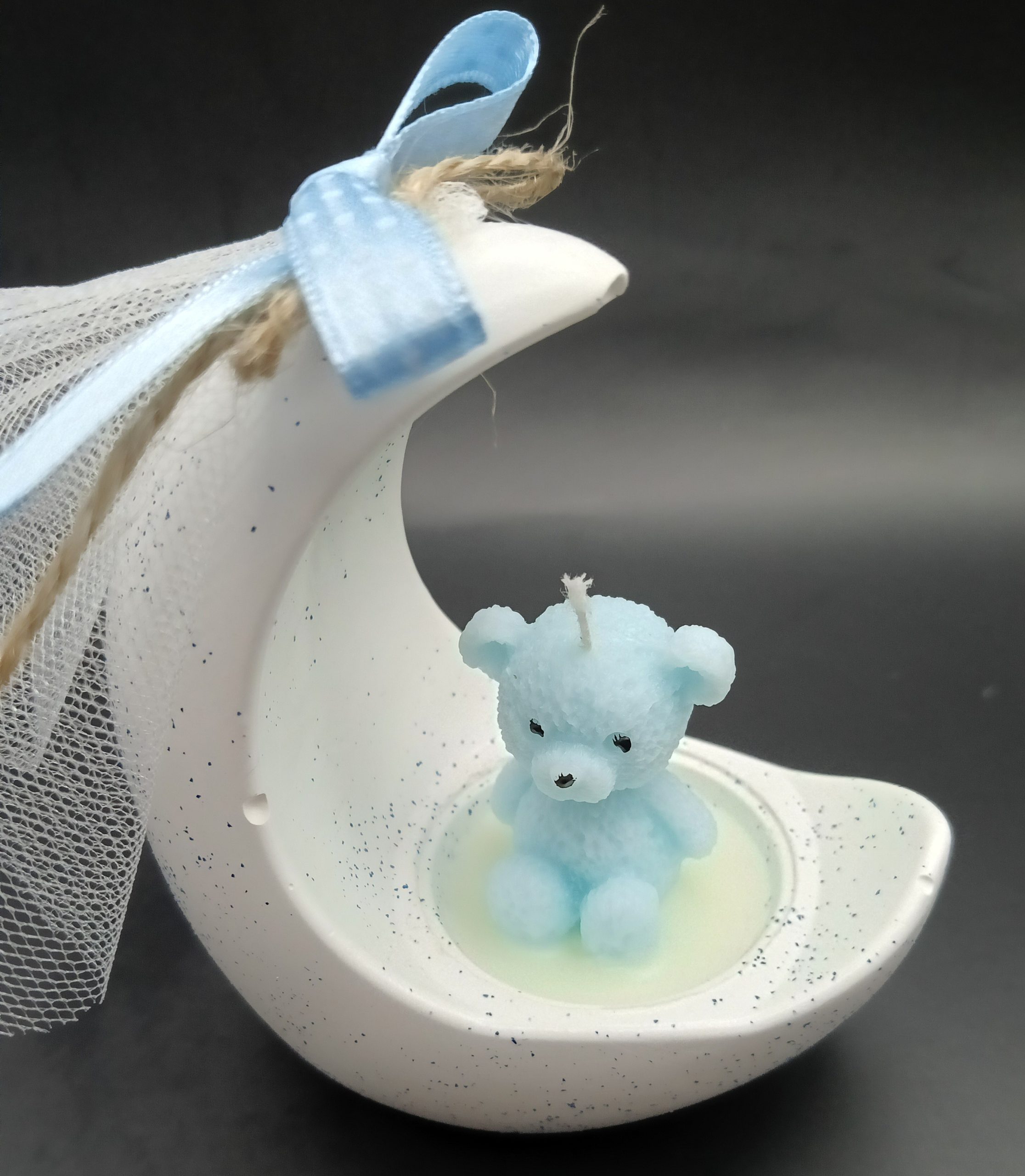 MAVİ AYICIK FİGÜRLÜ AY ŞEKLİNDEKİ EL YAPIMI MUM, HASTANE ZİYARETLERİNDE VE BEBEK KUTLAMALARINDA ŞIK BİR HEDİYE SEÇENEĞİDİR.